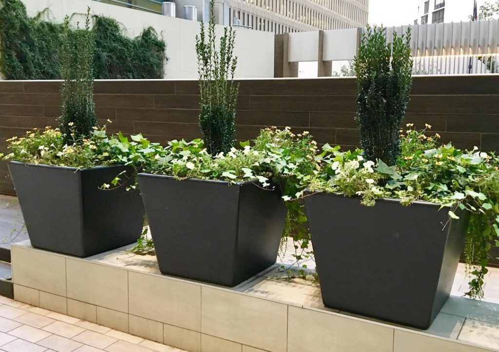 - Choose planters that match your theme. If it’s a sleek, modern look you’re cultivating, opt for fiberglass planters. For a more relaxed feel, then fiberclay pots are great. And for minimal fuss, maximum sophistication, an artificial hedge is your best bet.